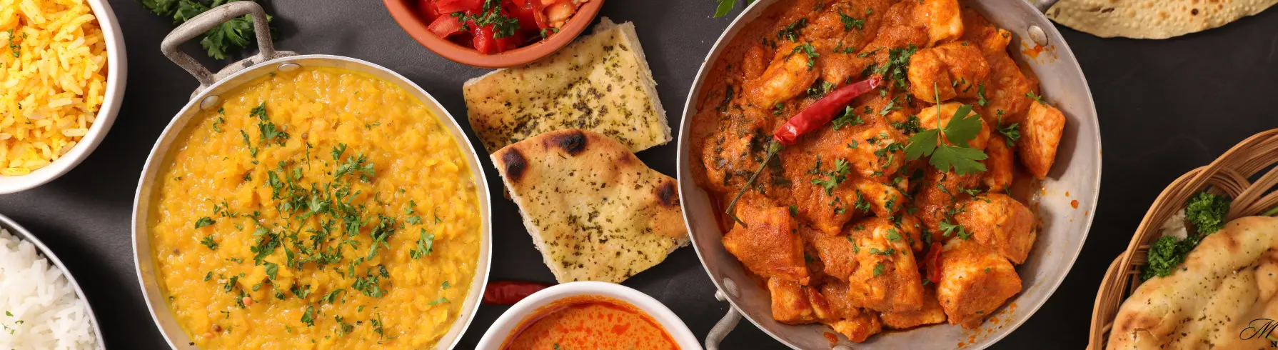 Starters: 4 Papadoms & pickles, sheek kebab, onion bhaji, chicken tikka... Main course: Chicken tikka mosalla, lamb saag, chicken jalfrezi, prawn balti Side dishes: Saag bhaji, mushroom bhaji Sundries: Pilau rice, garlic pilau, naan, pashwari naan Dessert: Sweet of the day